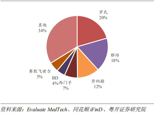 全球体外诊断市场发展成熟,行业集中度高,罗氏、雅培、丹纳赫(贝克曼)、西门子四足鼎立,形成垄断格局。2022年,罗氏、雅培、丹纳赫(贝克曼)、西门子诊断业务板块收入192.51亿美元、165.84亿美元、108.49亿美元、63.99亿美元,占行业规模20%、18%、12%、7%。