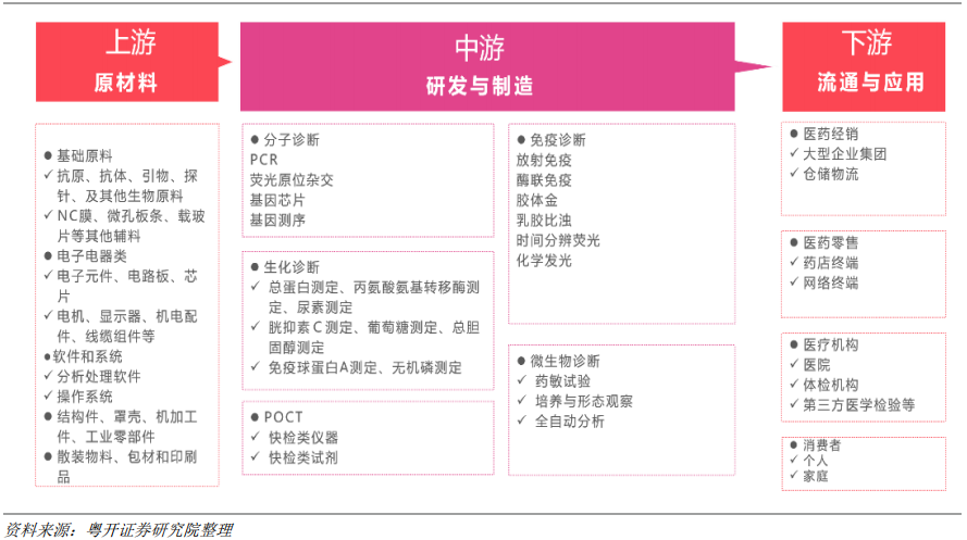 国内体外诊断行业形成了上游原材料-中游仪器与试剂研发制造-下游流通与应用完整的产业链条。上游原材料包括制造试剂盒所需的抗原、抗体、引物、诊断酶等关键核心生物原料以及 NC 膜、载玻片等辅料,制造仪器所需的电子元件、电路板、芯片等电子电器类材料以及软件系统等。中游仪器与试剂研发制造主要通过分子诊断、生化诊断、免疫诊断等不同技术原理路线开发制造新产品。下游流通与应用采取经销为主,直销为辅的方式将产品触达医院、体检机构、第三方医学实验室及个人用户等。