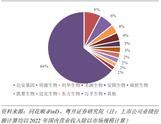 根据国家药监局公开数据统计,2017-2020年,我国可生产体外诊断产品的企业数量累计3445家,其中可生产第一类体外诊断产品的企业数量最多、增幅最高,2020年达到2648家,复合增长率为32.20%;可生产第三类体外诊断产品的企业数量增幅最小,2020年达553家,年复合增长率仅4.11%。截至目前,国内医疗器械上市器械企业116家,主营业务为体外诊断的共38家,2022年累计国内营收约为797.09亿元,约占行业规模的50.56%。其中,营收最高的4家公司累计收入344.55亿元,占行业规模的21.86%。营收最高的前10家公司市场占有率约为2%-8%,彼此间竞争激烈。