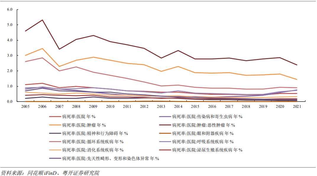 以我国常见高发、危害重大的疾病为切入点,生物标志物用于临床取得阶段性成果,早期诊断、疾病干预、追踪示警等方面需求被进一步满足。叠加技术方法快速迭代,如分子诊断技术 PCR(qPCR、dPCR、多重 PCR)、基因测序(NGS、mNGS、tNGS、纳米孔测序)、荧光原位杂交(FISH)等不断扩展,免疫诊断领域化学发光免疫分析(CLIA)逐渐取代放射免疫检验(RIA)、胶体金快速检验、酶联免疫检验(ELISA)、时间分辨荧光(TRFIA)等成为主流手段,整体诊断准确性和精确度提高,诊断窗口提前,以诊断结果为依据能够指导后续治疗并监测治疗进展,许多重病、大病、及常见病患者病死率普遍降低,行业供给水平不断优化。