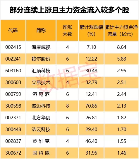 值得注意的是,121只连续上涨个股中,14只个股期间主力资金累计净流入超过亿元。其中,累计资金流入最多的为海康威视,主力资金累计流入8.64亿元。