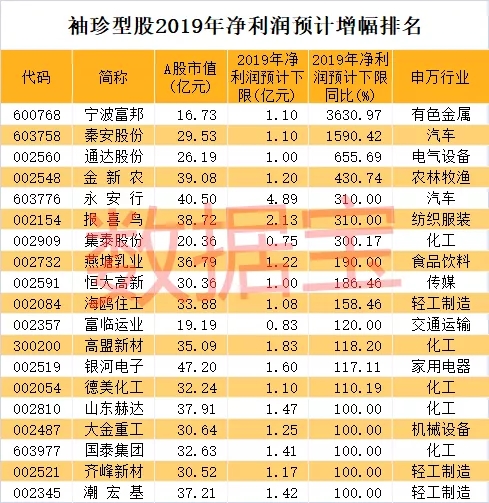 证券时报·数据宝统计显示,剔除近一年上市的次新股,A股市值在50亿元以下,2019年净利润预计增幅超过50%且折算后市盈率在30倍以下的股票,共计37只。按照净利润预计下限计算,净利润增幅最高的是宁波富邦,受铝板带材业务相关资产及负债的转让收益得到确认等影响,公司预计2019年净利润为1.1亿元左右,同比扭亏为盈。净利润预计增幅翻倍的还有秦安股份、通达股份、金新农、报喜鸟、永安行等。