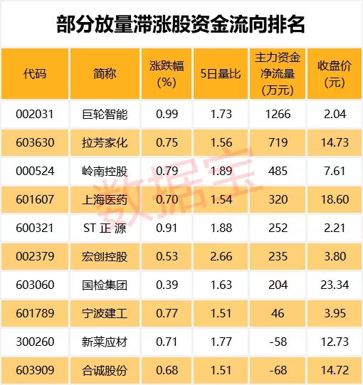 值得注意的是,15只放量滞涨股中,巨轮智能、拉芳家化、岭南控股、上海医药、ST正源等个股主力资金净流入较多。