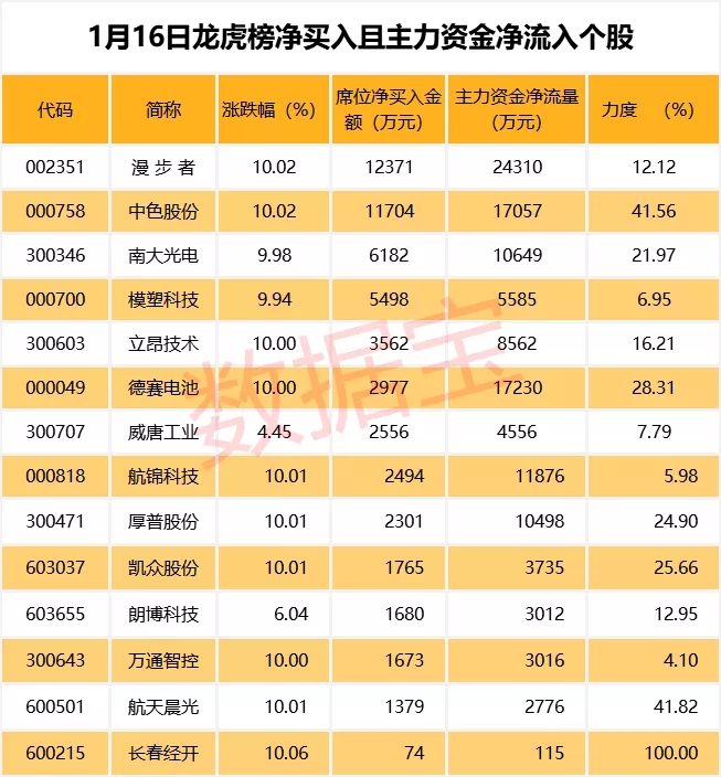 1月16日龙虎榜中机构及营业部席位资金净卖出0.63亿元,其中净买入的个股有20只;净卖出的个股有15只。净买入前三名个股分别是漫步者、中色股份、南大光电等,净买入金额占当日成交额比例达6.17%、28.52%、12.76%。