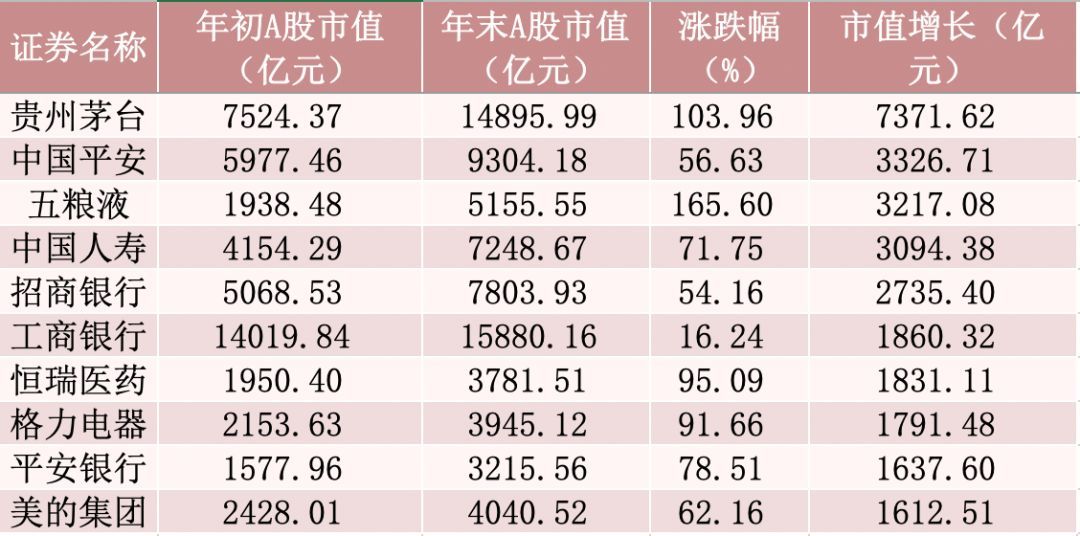 对于大牛股的衡量标准,除了单纯的涨幅以外,市值规模增加的绝对值也是一个重要考量。前述十大牛股虽然涨幅惊人,但由于市值偏小,获益的投资人只是一小部分“幸运儿”。而市值规模增加绝对值大的公司,其承载的资金量更多,获益的投资人数也更多更广。