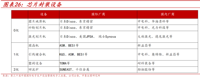 封装设备主要有磨片机、划片机、固晶机、键合机、塑封设备、打标设备等。冯胜表示,先进封装有望增加设备需求,主要为研磨设备增加(晶圆需要做的更薄)、切割设备需求增加、固晶设备(DieBond要求更高)。此外,新设备需求主要为:如凸块(bump)工艺涉及到曝光、回流焊等设备;TSV工艺增加新设备需求。