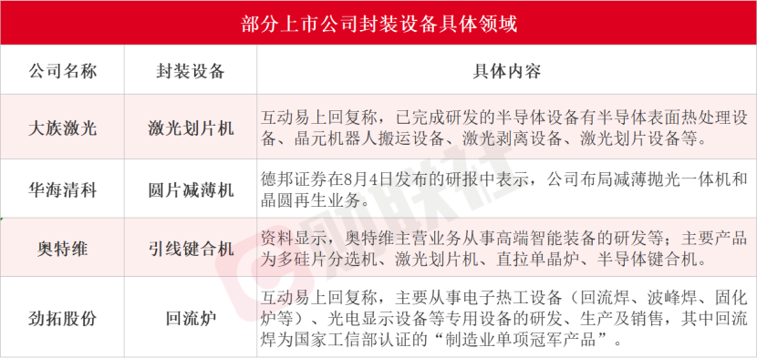 据财联社整理,大族激光、华海清科、奥特维、劲拓股份这四家公司在封装设备布局的具体业务如下: