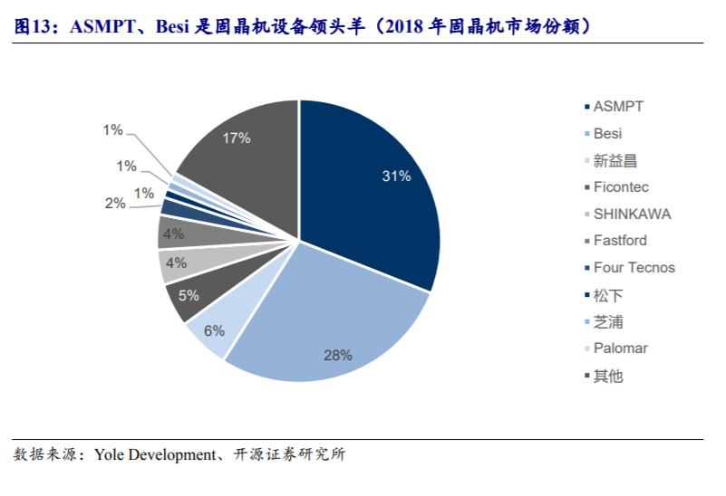 开源证券刘翔等人在7月5日发布的研报中表示,固晶机和焊线机是半导体封测环节价值量最大的设备。Yole Development数据显示,2018年,ASMPT占据全球固晶机31%的市场份额;Besi紧随其后,市占率28%;新益昌位列第三,市占率6%。