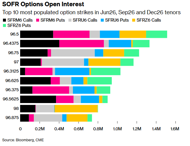 过去一周,执行价为96.625的期权未平仓合约大幅增加,资金流向集中在年底的下行保护。例如,有买家买入2026年12月到期、执行价为97.00/96.625的1x2看跌期权价差。过去一周,对96.25执行价的期权也有需求,2026年6月到期的看涨和看跌期权未平仓合约增加——资金流向包括过去一周买入的SFRM6 96.50/96.375/96.25/96.125看跌期权蝶式价差。96.50执行价的期权交易也很活跃,近期的资金流向包括买入SFRZ6 96.50/96.75/97.00/97.25看涨期权蝶式价差、SFRM6 96.50/96.375/96.25/96.125看跌期权蝶式价差以及SFRM6 96.50/96.375/96.3125/96.1875看跌期权蝶式价差。