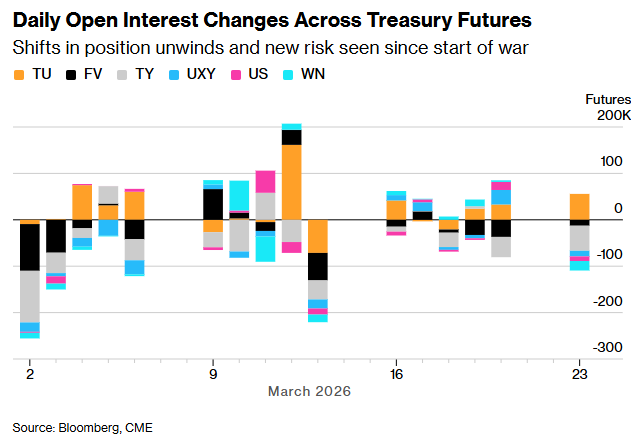 就在2月28日美以对伊军事行动爆发前,美国国债期货市场的头寸明显偏向押注利率下行。这在一定程度上反映出投资者对经济增长前景的担忧。然而,随着战争引发油价飙升,这些担忧突然被通胀忧虑所取代,导致措手不及的交易员被迫退出头寸,进而加剧了市场下跌。