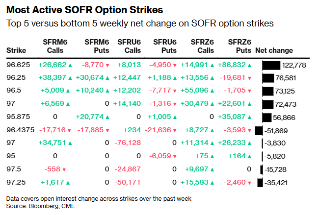 总体而言,在2026年6月、9月和12月到期的期权中,持仓最集中的执行价是96.50,大量2026年6月到期的看涨和看跌期权风险仍集中于该价位。6月SOFR期权将于6月12日到期,比6月17日的政策声明早一周。此外,在执行价96.4375附近也有大量未平仓合约,相关资金流向包括买入SFRM6 96.4375/96.50看涨期权价差,同时卖出2QM6 97.375看涨期权——这是一种看涨蝶式价差结构的头寸,成交量约为10万份与5万份之比。