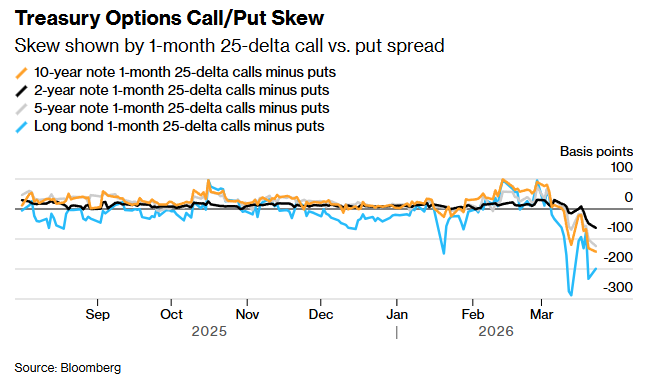 此外,用于对冲美国国债期货风险的期权权利金水平,已持续脱离数月极值区间,但仍明显偏向看跌期权,尤其是在更长期限结构中。