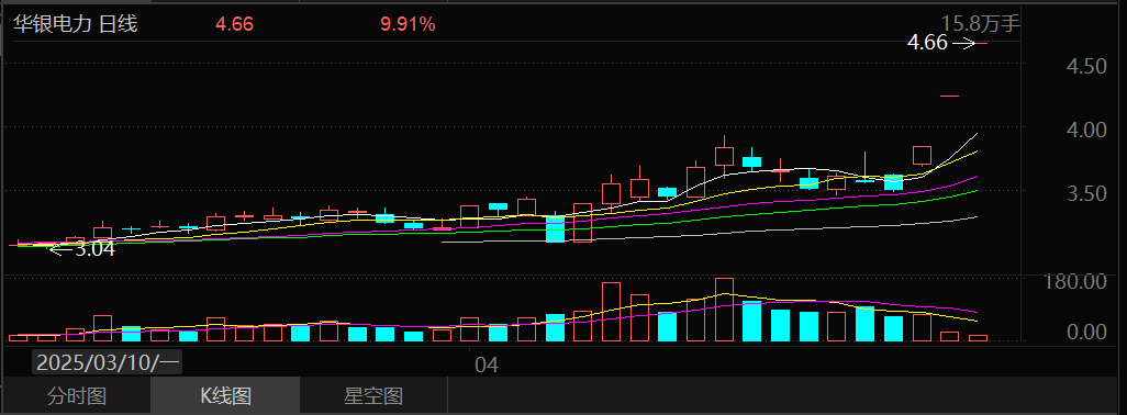 电力股早间集体走强,板块指数盘中一度放量直线拉升涨逾1%,创年内新高。华银电力一字涨停,连续第3日封板,股价创2年半新高(复权),华电能源、三峡水利、华电辽能、京能电力等纷纷涨停。