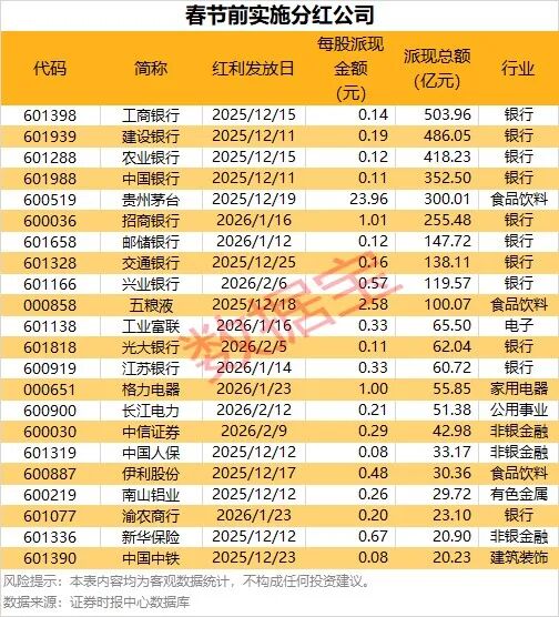 以红利发放日进行统计,春节前(2025年12月1日至今)有近300家公司实施分红,合计派现金额近3900亿元。分行业统计,银行股合计分红超2600亿元,占春节前合计派现金额的近七成,派现金额前三的均为银行股,工商银行合计派现超500亿元,其次是建设银行、农业银行,派现金额均在400亿元以上。