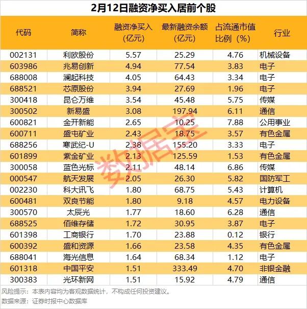 截至2月12日,市场融资余额合计2.63万亿元,较前一交易日增加15.14亿元。具体到个股,2月12日共有1464股获融资净买入,净买入金额在千万元以上的有415股,其中43股融资净买入额超1亿元。利欧股份融资净买入额居首,当日净买入5.57亿元;其次是兆易创新、澜起科技,融资净买入金额分别为4.94亿元、4.05亿元;融资净买入金额居前的还有芯原股份、昆仑万维、新易盛等。分行业统计,获融资客净买入超1亿元个股中,电子、通信、计算机等行业较为集中,分别有10只、6只、6只个股上榜。