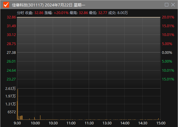 二级市场上,佳缘科技周一收盘20CM一字涨停,拿下2连板。