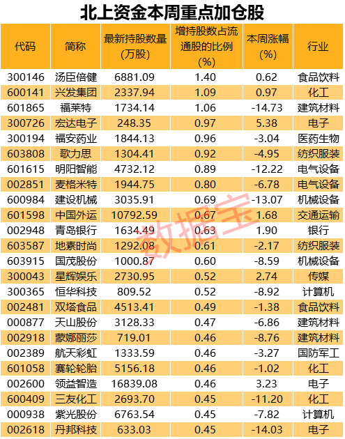 数据宝统计显示,北上资金连续四周买入78股。分行业来看,化工行业个股较多,有8只。