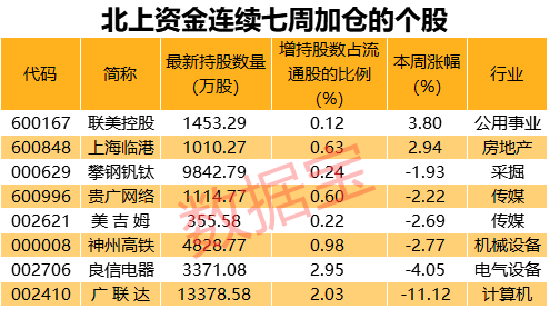 将时间拉长,8股被北上资金连续七周加仓。从持股比例变动情况来看,良信电器获加仓幅度最大,较七周前增持股数占流通股的比例2.95%;其他连续加仓的还有广联达神州高铁联美控股等。