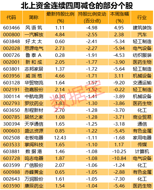 北上资金连续四周减仓95股