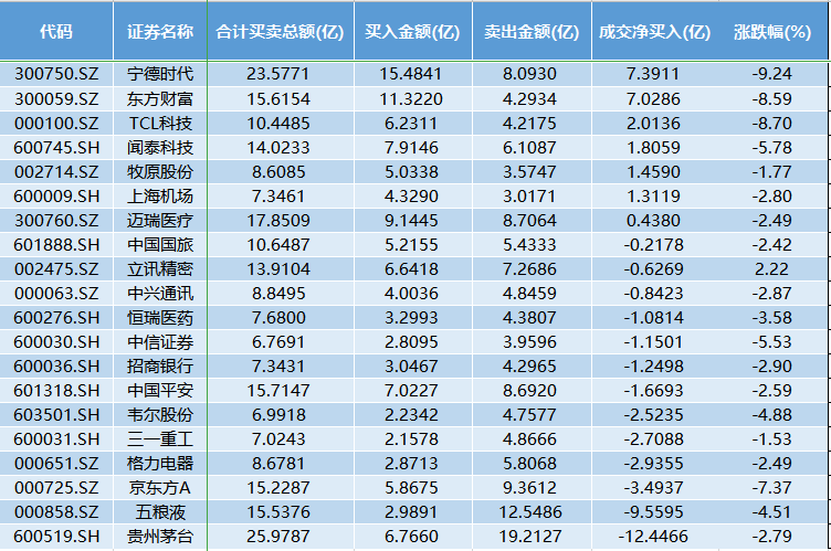 今日下跌9%的宁德时代则成了北上资金净买入最多的股票,共净买入7.4亿元,此外,暴跌8.6%的东方财富也被净买入逾7亿,今日晚间,东方财富发布业绩快报显示,公司去年净利润大增90%。