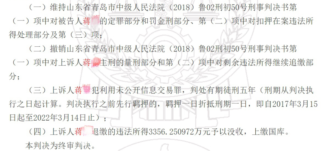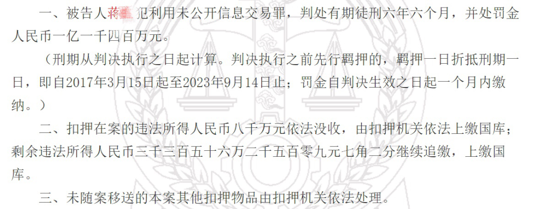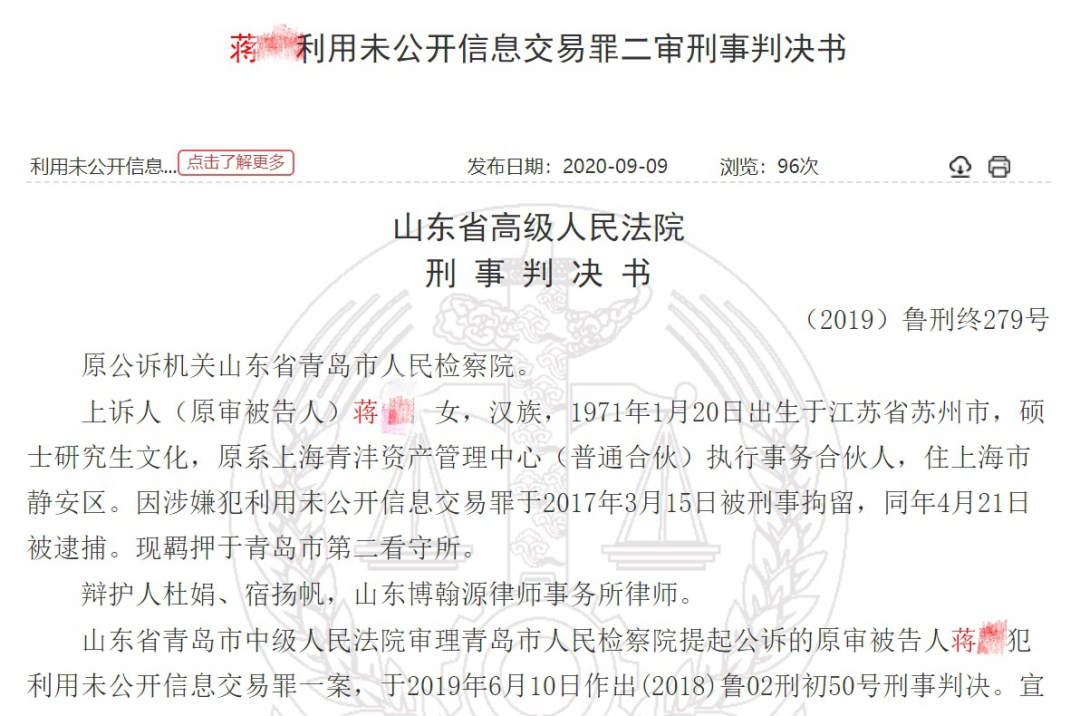 9月9日,山东省高级人民法院公布了一则刑事判决书,判决书显示,蒋某因利用未公开信息交易罪被判处有期徒刑五年。