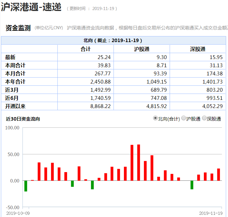 19日收盘,北向资金净流入25.24亿元,其中沪股通净流入9.3亿,深股通净流入15.95亿,连续第四个交易日净流入,近18个交易日17个交易日近流入。