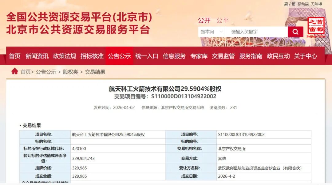 据北京市公共资源交易服务平台发布信息,近日,航天科工火箭29.5904%的股权以约33亿元的底价成功转让,受让方为武汉投控集团旗下的武汉武创星航创业投资基金。