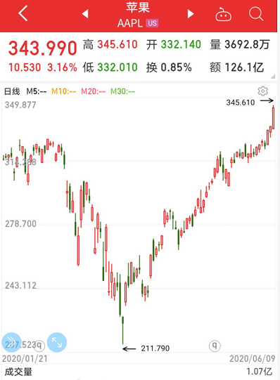 6月8日,纳斯达克指数首次站上9900点,创下历史纪录以来的新高,隔夜纳指又首次短暂站上10000点关口,继续刷新历史。自从纳指3月23日见底反弹以来,两个多月时间里已上涨45%。伴随着纳指再创新高,美国大型科技股集体大涨,苹果涨3.16%,亚马逊涨3.04%,奈飞涨3.47%,Facebook涨3.14%,eBay涨2.11%。