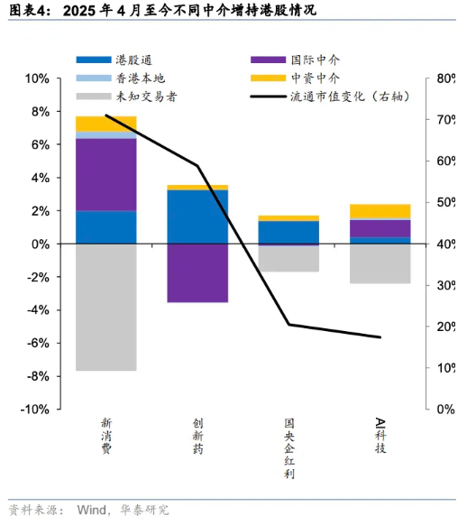 华泰证券在《海外市场2H25展望:再平衡进行时》(2025.6.3)中测算,现存公募增配或带来5000亿港币流入,若考虑其他南向投资也完全按测算比例配置,增配空间高达万亿港币。南向资金也是港股行业轮动的核心动力。以港股通中介持股数据测算,今年2-3月行情中,南向大幅增持港股(0.7pct,数值指该中介持股占比变动,下同),红利、新消费、AI科技和创新药四个板块均有增持(0.4pct、0.5pct、0.9pct、1.5pct);4月以来南向继续增持港股(1.0pct),并加大创新药、新消费和红利增持力度(3.2pct、2.0pct、1.4pct),AI科技增持幅度放缓(0.4pct)。