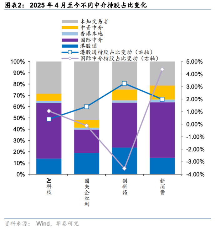 EPFR口径下,年初至今外资净流入2.1亿美元,其中主动型外资流出54.4亿,被动性外资流入56.5亿。在美元走弱,国内地产调整进入后半场的大背景下,外资已不再流出香港市场(25年至今流入2.1亿美元 vs. 24年流出31.5亿美元)。从国际中介持股口径看,2~3月及4月以来的港股两段行情中外资也有增持,但后半段行情增持幅度相对南向更低(分别增持0.8 pct、0.1pct)。结构上,年初科技行情期间外资减持红利及创新药(-0.5pct、-0.2pct),增持AI科技及新消费(0.8pct、1.1pct),4月以来趋势进一步强化。往后看,在人民币不再走弱甚至有升值预期的大背景下,华泰证券对外资在中国资产进行分散性配置的需求并不悲观。