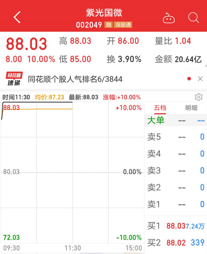 昨日涨停并突破历史高点的紫光国微今天大幅高开,9点33分即封上涨停板。截至午间收盘,紫光国微报88.03元,涨幅为10%,市值超过500亿元。昨天的龙虎榜似乎已提前揭示该股今天的强势。数据显示,昨日龙虎榜该股有三家机构席位,合计买入7.42亿元,中信证券股份有限公司上海分公司买入1.76亿元。