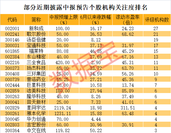 市场焦点有望逐渐转向中报。比如昨天披露中报业绩预告的三全食品,今天开盘涨停;普洛药业大幅高开涨停。数据宝统计显示,6月以来披露了中报业绩预告且预告净利上限同比增长超过20%的个股,合计有40只。