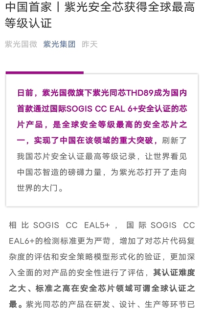 早前,紫光集团发布消息称,紫光国微旗下紫光同芯 THD89成为国内首款通过国际 SOGIS CC EAL 6 + 安全认证的芯片产品,是全球安全等级最高的安全芯片之一,实现了中国在该领域的重大突破。
