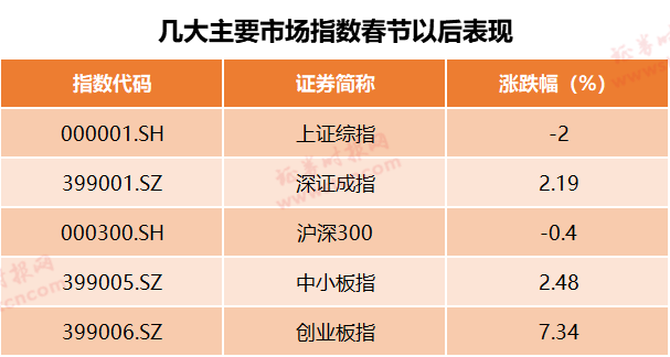 结合A股市场各主要指数表现来看,今年农历春节以后沪指累计仍下跌2%,深证成指上涨2.19%,中小板指上涨2.48%,创业板指则累计大涨7.34%。