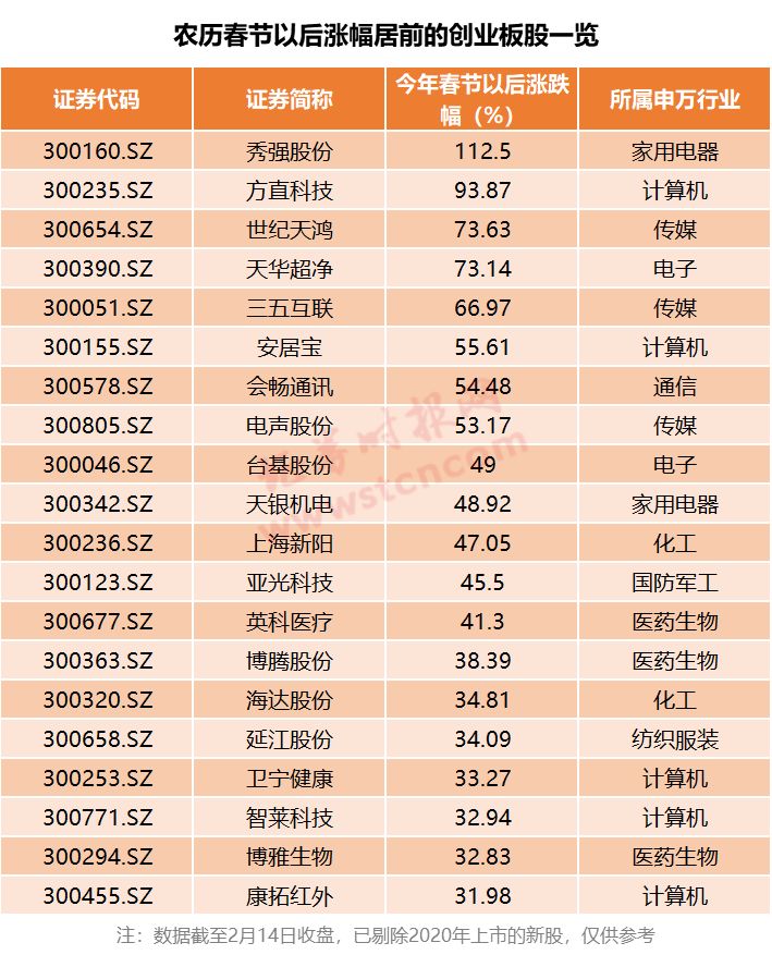 不过,从结构上看,创业板内部分化较为明显.,多数个股近期表现远远跑输指数。统计数据显示,今年农历春节后,上涨的创业板个股为320只,不到创业板个股总数的一半(注:在剔除2020年上市的创业板新股后,创业板个股总数为791只)。数据显示,这段时期创业板表现较好的个股中,大医药、TMT等受疫情冲击较小的行业个股涨幅居前。