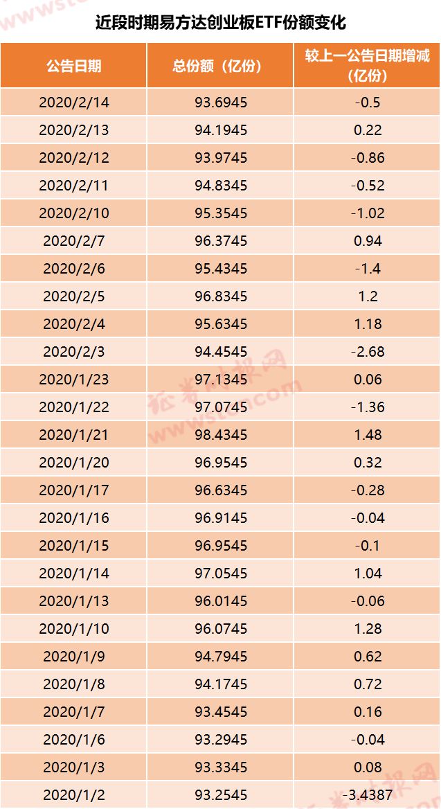 数据显示,作为当前市场规模最大的创业板指数基金之一,易方达创业板ETF近期份额在增长后呈现下滑之势。春节前,该基金份额一度高达98.4345亿份,但截至目前,已降至93.6945亿份。