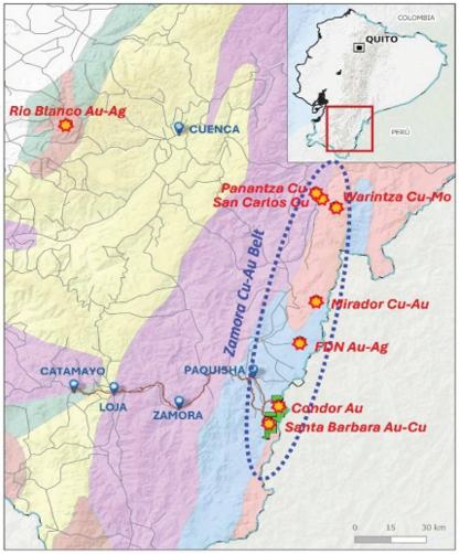 Santa Barbara 金铜矿位于厄瓜多尔东南部萨莫拉铜金成矿带,毗邻多个已投产或在建大型矿山,处于成熟矿业集群的核心辐射范围内,具有显著的区位优势。该项目有52 平方公里的勘探许可证。