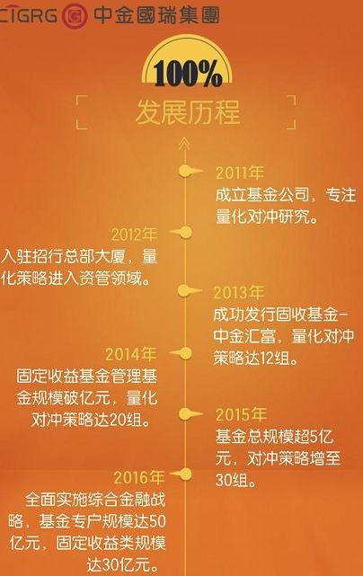 中金国瑞集团的官微介绍也显示,公司在2011年成立基金公司,专注量化对冲研究,2013年发行固收基金-中金汇富,2014年固定收益基金规模破亿元,2015年基金总规模超5亿元,2016年全面实施综合金融战略,基金专户规模达到50亿元,固定收益类规模达30亿元。