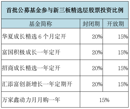 根据运作方式不同,上述几只基金在新三板精选层上的投资比例也存在差异。定期开放的几只基金在封闭期时,在新三板精选层的投资比例为20%,开放期则降低至15%;而万家月月购则不区分开放期或封闭期,一直维持15%的新三板精选层投资比例运作。