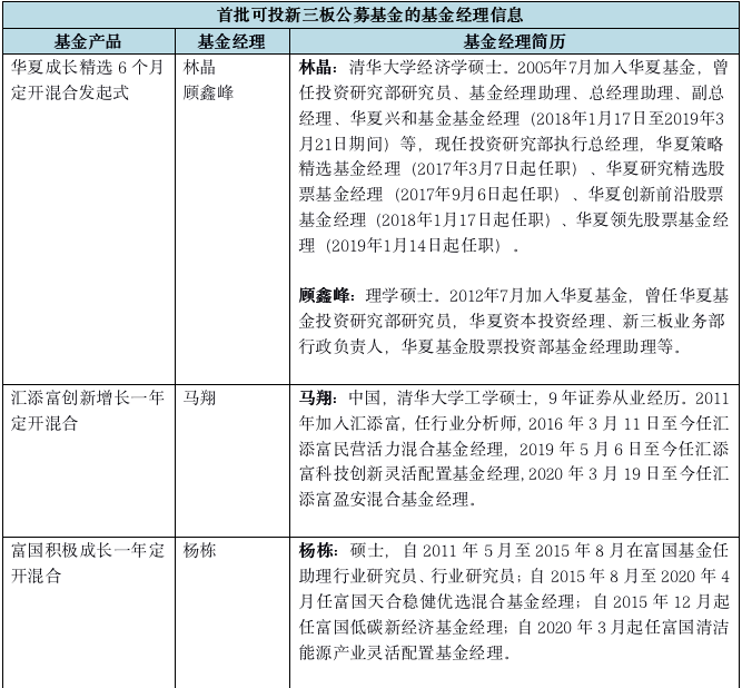 与每次创新类基金一样,各大基金公司都用上旗下优质基金经理来管理新产品,以期待有较好业绩表现。这次可投资新三板的主动权益基金也是一样,各家公募同样派出“精兵强将”管理,不少公司还采取了双基金经理来保障基金顺利运作。