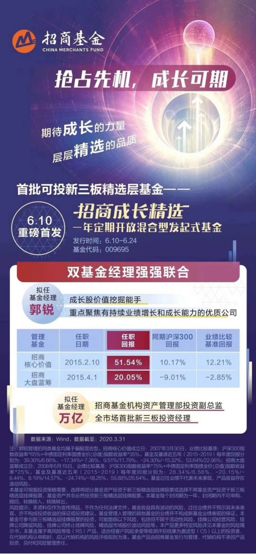 招商基金也采取了双基金经理制,拟任基金经理郭锐投资偏长期视角,持续跟踪企业把握盈利增长的确定性,擅长把握成长型股票的中长期投资价值,过往偏股型产品业绩良好;拟任基金经理万亿拥有丰富的新三板研究和投资管理经验。