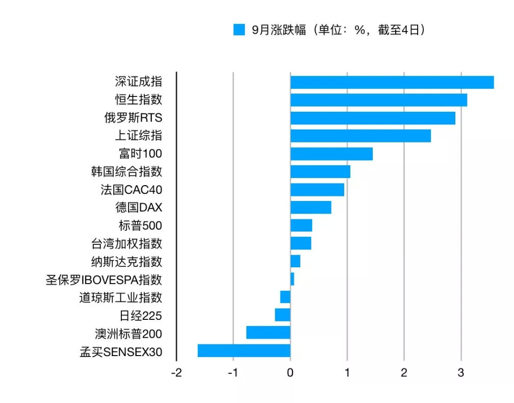 9月的开头,虽然欧美股市不太给力,但中国市场(A股+港股)却精准地验证了这句谚语,成为全球股市的领头羊。Wind数据显示,即便不算上今天上午的大涨,A股也是9月全球市场的佼佼者。深证成指雄踞全球股指区间涨幅榜第一。