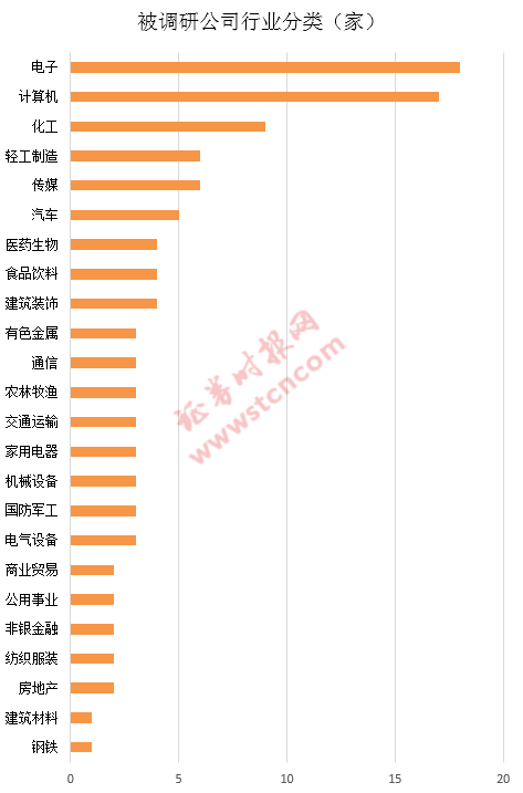 按行业分类看,上周被调研公司中,电子行业涉及的公司数量最多,为18家。计算机行业紧随其后,有17家公司被调研。另外,化工、轻工制造、传媒等行业被调研的公司数量也较多。