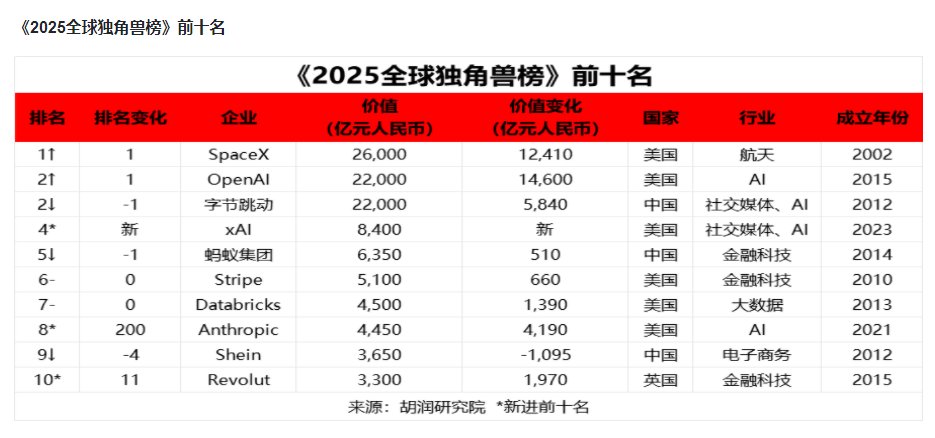 胡润研究院发布《2025全球独角兽榜》:SpaceX超越字节跳动成为全球第一独角兽