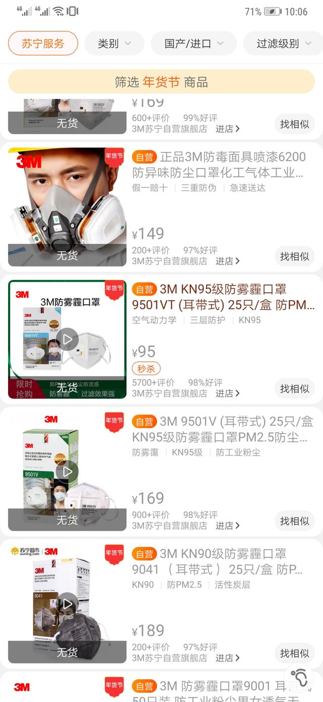 在苏宁平台,“戴上口罩,远离病毒”成为热搜榜推荐词,但在3M苏宁自营旗舰店,“KN95”、“3M防尘口罩”、“正品3M防毒面具”等产品均已无货。在可孚苏宁自营旗舰店,两款医用口罩显示“本地区无货”。