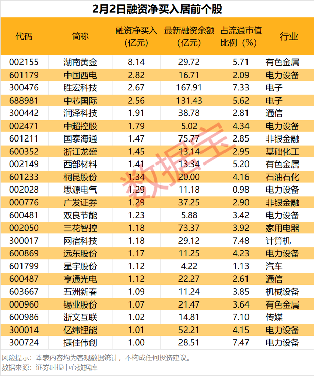 具体到个股,2月2日共有1791股获融资净买入,净买入金额在千万元以上的有497股,其中23股获融资净买入额在1亿元及以上。