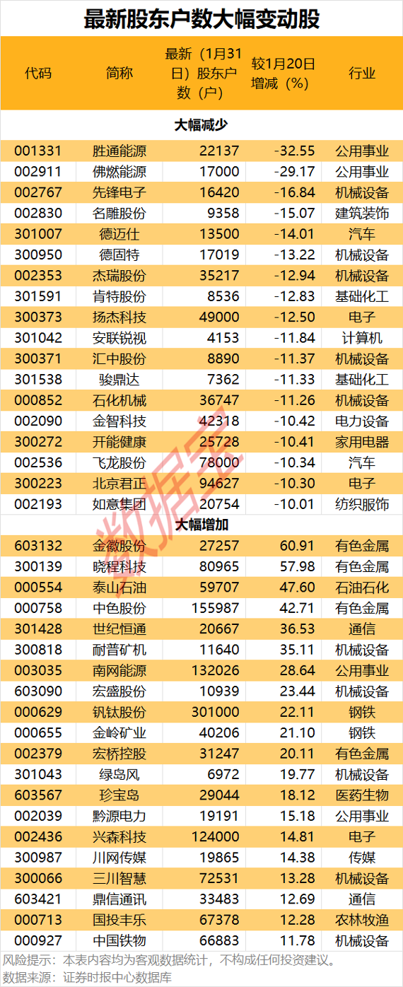 股东户数降幅最多的是胜通能源,截至1月31日最新股东户数为22137户,较1月20日下降32.55%;其次是佛燃能源,最新股东户数为17000户,较1月20日下降29.17%。