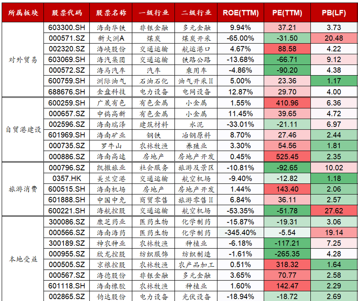 【摘要】 为稳步推进海南自由贸易港建设,进一步满足消费者多元化购物需求,财政部、海关总署、税务总局联合印发公告,调整海南离岛旅客免税购物政策,并定于11月1 日起实施;九部门联合印发《关于促进住宿业高质量发展的指导意见》,《指导意 见》从培育经营主体、扩大品质供给、加快绿色发展、优化发展环境、强化要素支撑、夯实工作基础六个方面,提出 17 项具体政策。 海南封关落地,本文梳理了四大方向: (1)海南地区有较大对外贸易业务的公司:正式封关后,进口享零关税,出口享退税,进出口贸易量有望增加,航运、进出口企业有望受益; (2)有望受益于自贸港及其配套建设的公司:由于封关后从海南销往内地免税存在增值30%的门槛,海南省厂房建设、设备,以及劳动力配套的住房需求增加,地产、建材等企业有望受益; (3)海南旅游消费相关公司:正式封关后,免税范围扩大,免税消费对国内外游客的吸引力提升,旅游、酒店、零售、机场公司有望受益; (4)其他海南本地公司:海南自贸港享受“零关税、低税率、简税制”,海南企业普遍受益。 |