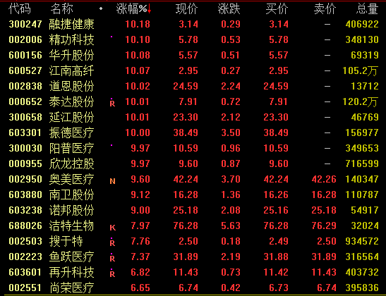 口罩防护概念24日盘中再度走强,截至发稿,融捷健康、精功科技、华升股份、江南高纤、道恩股份、泰达股份、延江股份、振德医疗、欣龙控股等涨停,奥美医疗、南卫股份涨幅超9%。