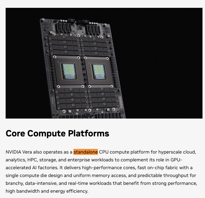 英伟达官网也显示,Vera可作为独立的CPU计算平台运行。
